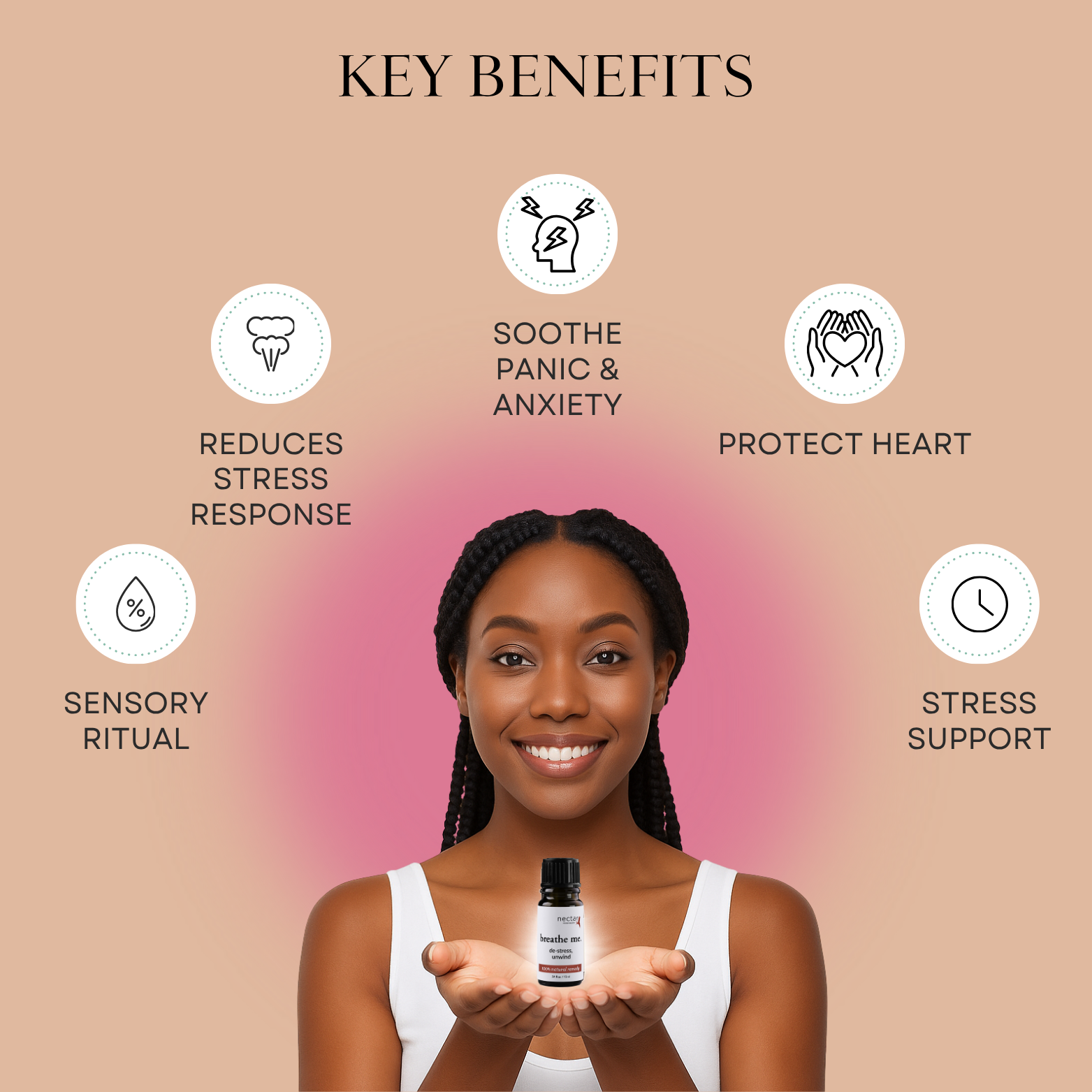 Breath: Place two drops in palms. Rub hands together. Cup hands over nose and mouth. Inhale deeply. Repeat for 30 seconds.
